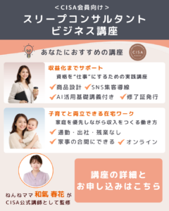 CISA認定小児スリープコンサルタント資格受講生・取得者を対象とした本講座では、SNS総フォロワー数20万人超のインフルエンサー「ねんねママ」が講師を務め、SNSを活用したビジネススキルを学ぶことができます。商品設計、集客導線、発信内容、リピート顧客の獲得方法など、実践的な知識を詰め込んだ内容です。また、これからビジネスをするにあたり、必要不可欠なAI活用基礎講義も特典として提供します。